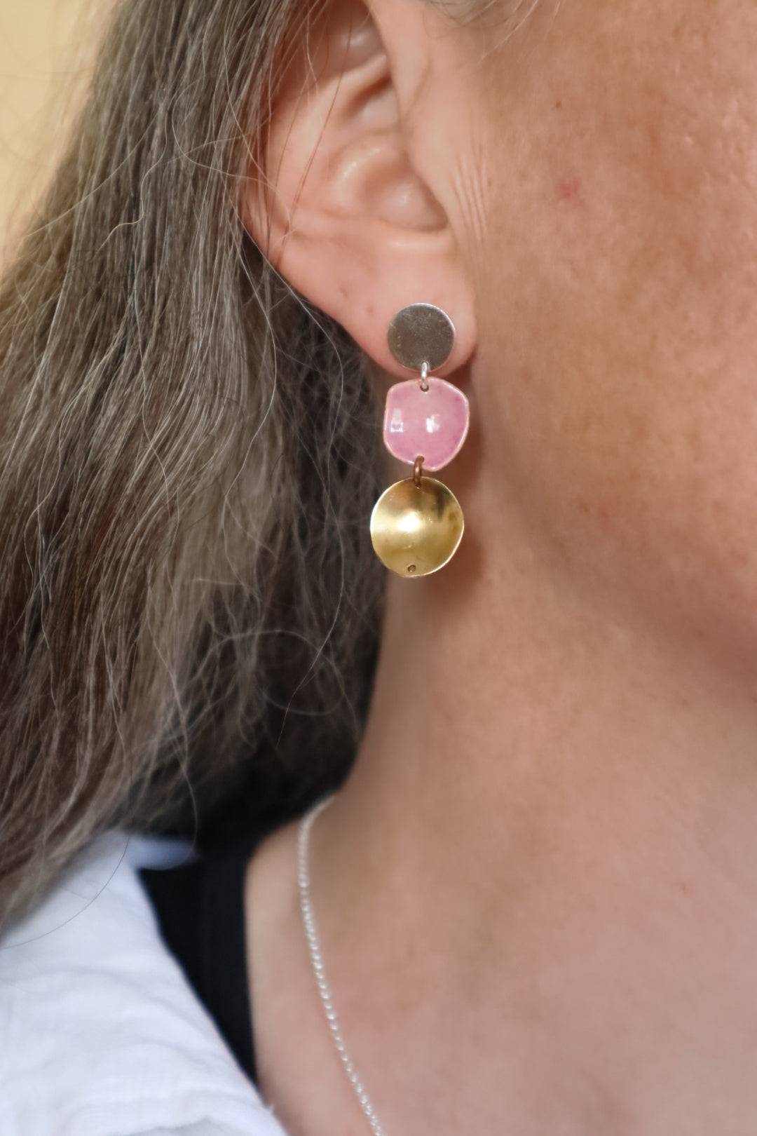 Aros fabricado a mano en bronce, cobre y tope de plata, esmaltado a fuego. En este collar seleccione distintas piezas de ejercicios de calado que realizamos con alumnos, una manera de reciclar ese material que estaba disponible, mediante el lijado, forma y color le doy nueva vida.