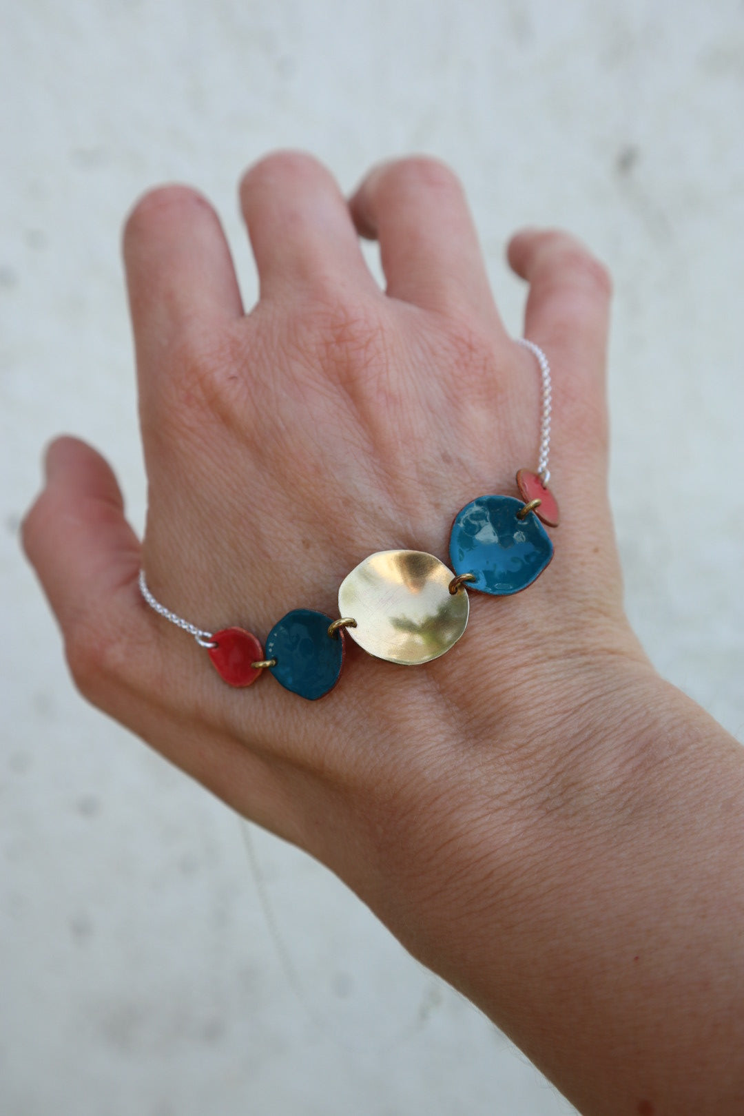 Collar fabricado a mano en bronce, cobre y cadena de plata, esmaltado a fuego. En este collar seleccione distintas piezas de ejercicios de calado que realizamos con alumnos, una manera de reciclar ese material que estaba disponible, mediante el lijado, forma y color le doy nueva vida.
